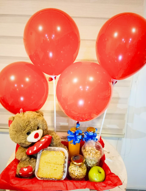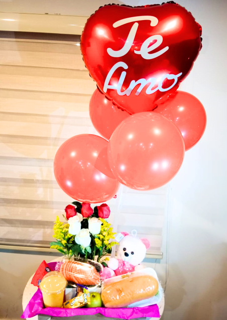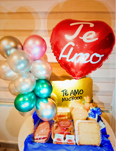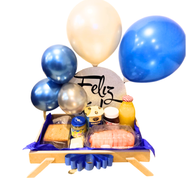 Mantecada. Avena alpina. Compota. Queso pera. Nutella mediana. Jugo de naranja. Porción de fruta. Bandeja de madera. Decoración con globos. Tarjeta con mensaje personalizado.