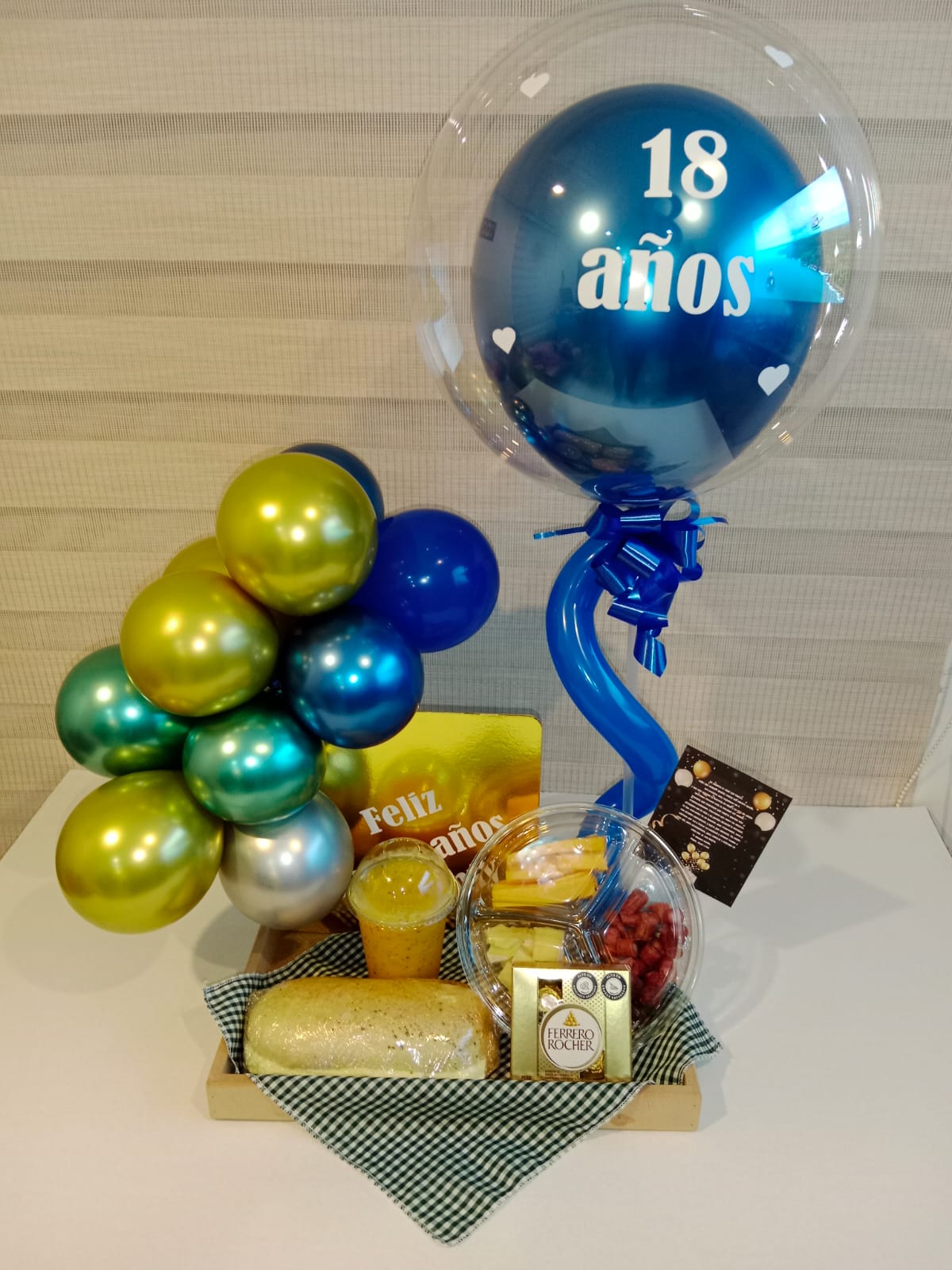 Bandeja con: Queso Semimadurado, Queso Paipa y Cábanos, chocolates ferrero por 4 unidades, Sanduche con pernil de cerdo o Pavo, frutibatido de frutos rojos o amarillos,Globo burbuja personalizado, decoración con globos y mesa de madera.