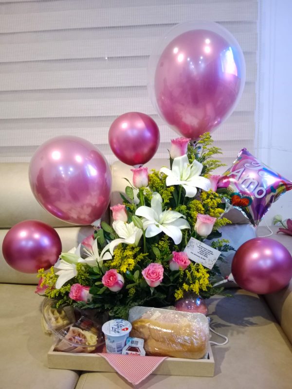 Sanduche, Yogurt alpina, Frutibatido de frutos rojos o frutos amarillos, nutella personal, Bandeja con: rollos jamón y queso, porción de fruta y  waffle con fruta. Arreglo floral con rosas y lirios, decoración con globos, mesa de madera.