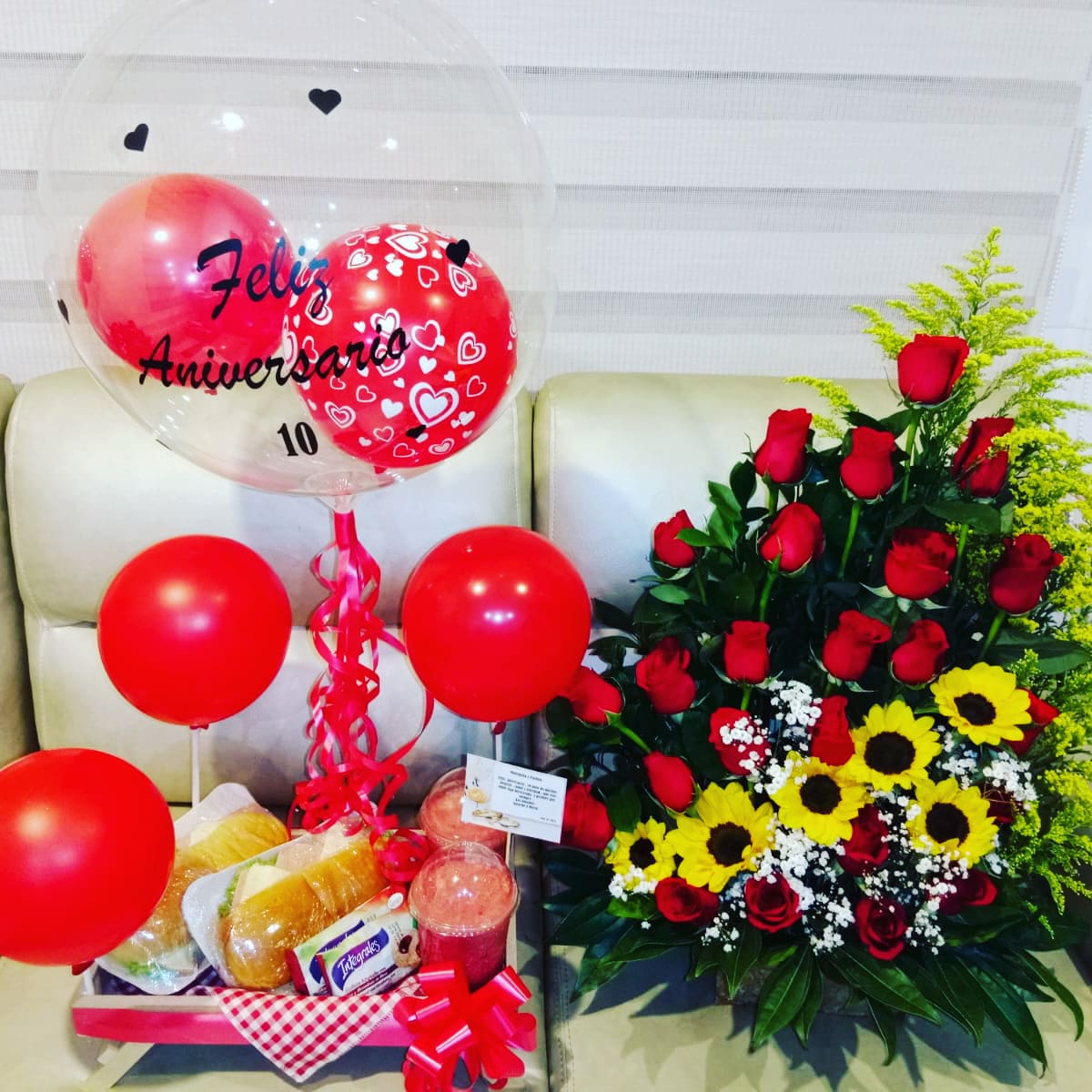 Contiene: Arreglo floral de 24 rosas y minigirasoles, dos sanduches, dos frutibatidos, dos paquetes de galletas, decoración con globos y burbuja personalizada, caja de madera