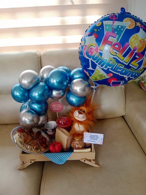 Peluche, waffle con fruta y chocolate, sanduche personal, tarro de maní, frutibatido, yogurt alpina, manzana, decoración con globos, caja de madera