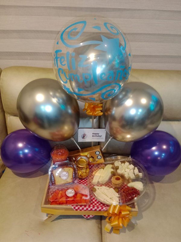 Bandeja de quesos, porción de fruta, porción de mantecada, tarro de maní, ferrero por 8, frutibatido, base de madera, decoración en globos