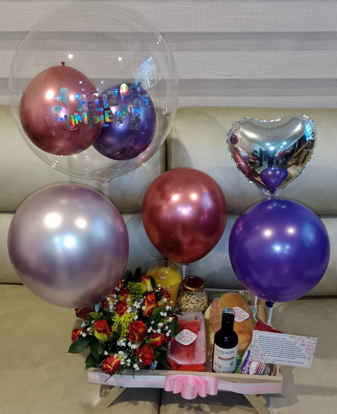 Arreglo floral, porción de fruta, sanduche, frutibatido, tarro de mani, botella de vino de 187 ml, galletas, bandeja de madera, decoración en globos