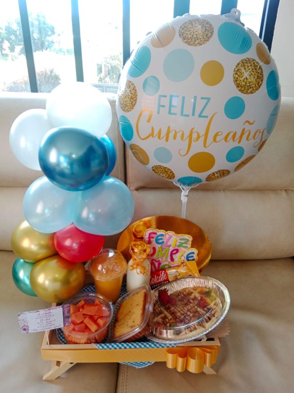 Porción de mantecada, waffle con fruta y chocolate, porción de fruta, frutibatido, frasco de leche y bolsa de capuchino, bandeja de madera y decoración en globos