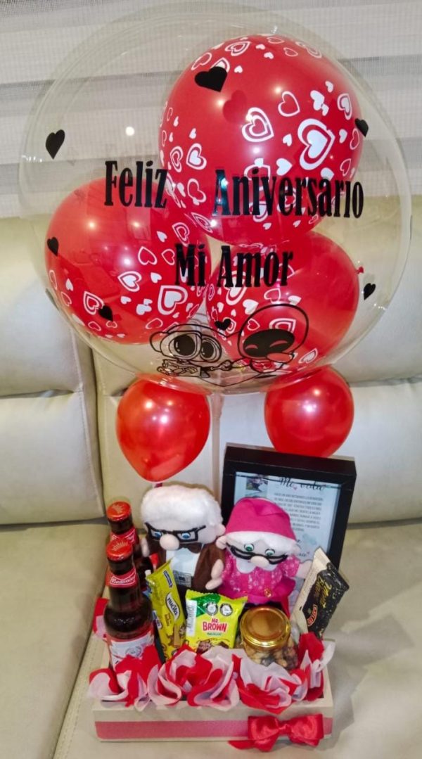 Dos cervezas, tarro de mani, chocolatina, brownie, galletas, peluche a elección, cuadro con foto o tarjeta especial, mesa de madera y decoración en globos.