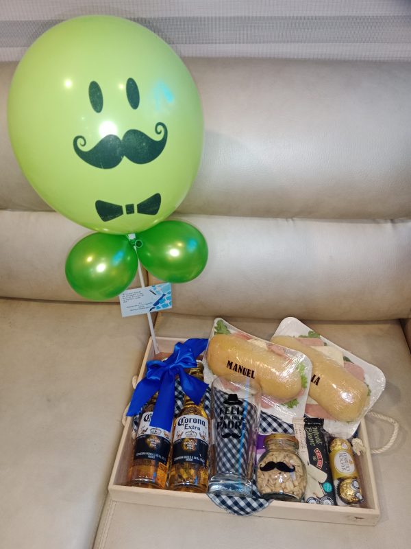 Dos coronitas, dos sanduches, vaso Cervecero, tarro maní, chocolatina, Ferrero por 3, bandeja de madera y decoración