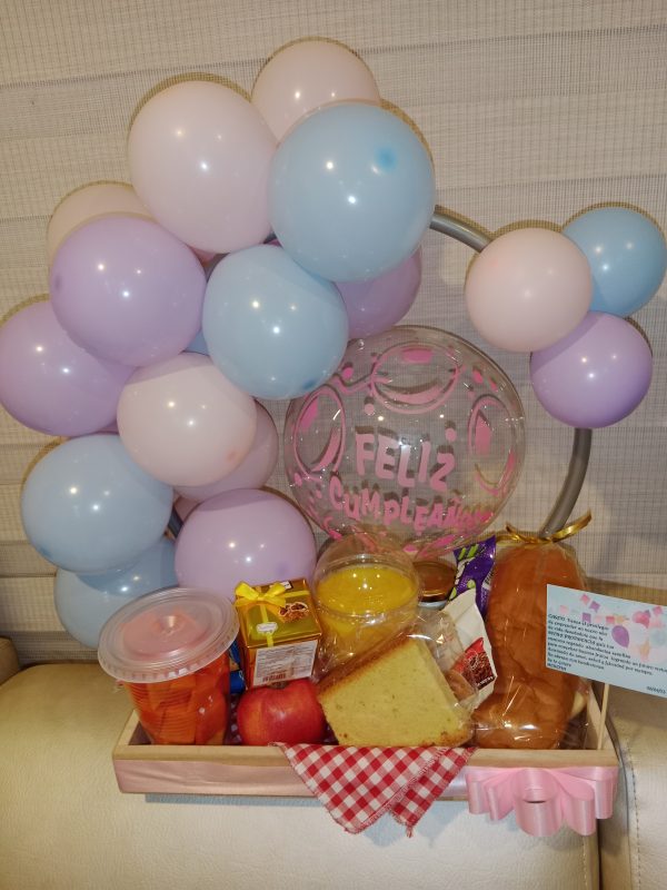 Contiene: Sanduche – mantecada – tarro de leche – café – frutibatido – porción de fruta picada – manzana – galletas – chocolatina- caja de madera- decoración en globos – globo burbuja personalizado – tarjeta.