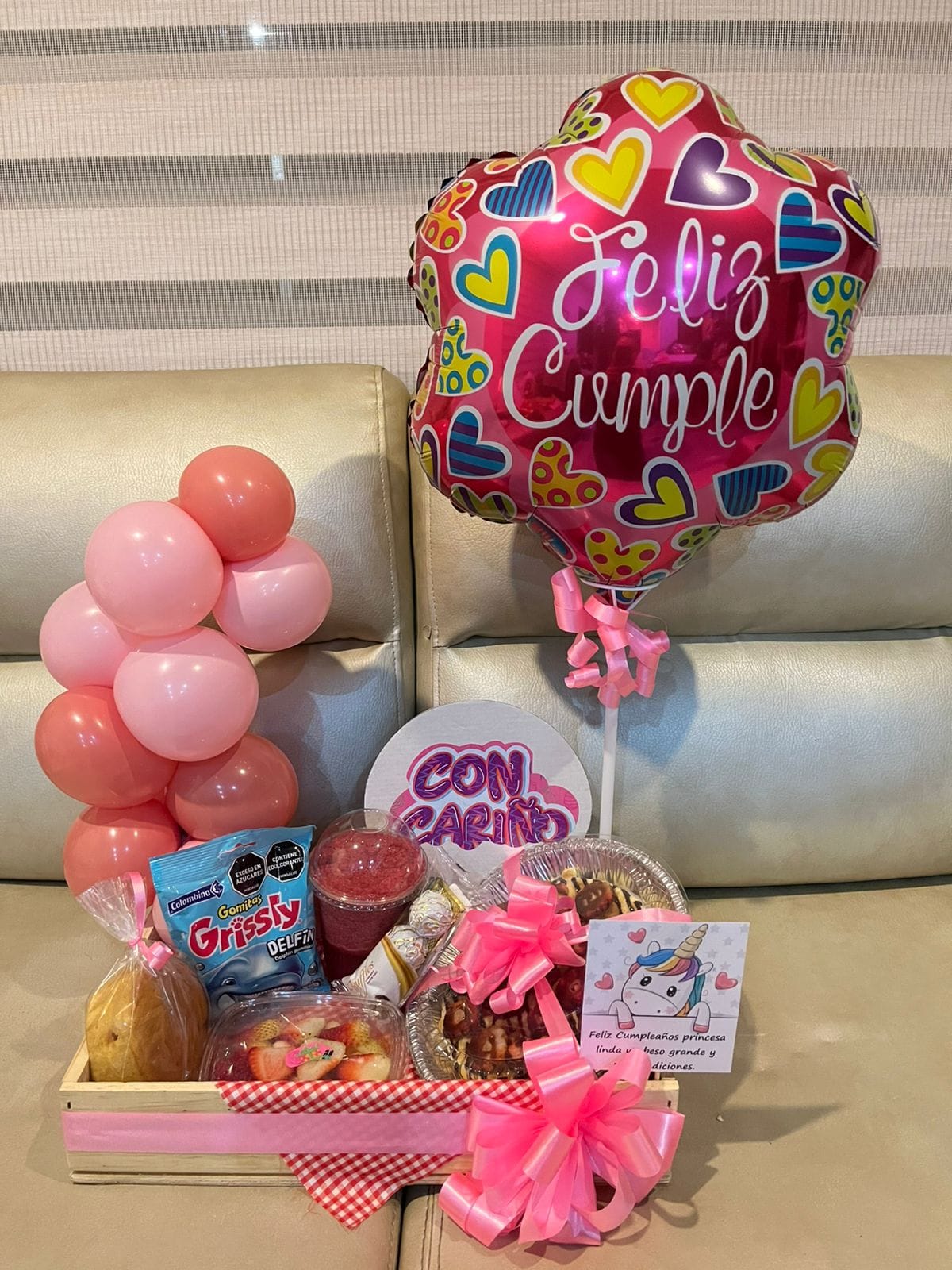 Contiene: Waffle con fruta y chocolate, porción de fruta, mantecada, frutibatido, gomitas, chocolatina, caja de madera con decoración de acuerdo a la ocasión, mantel y tarjeta personalizada